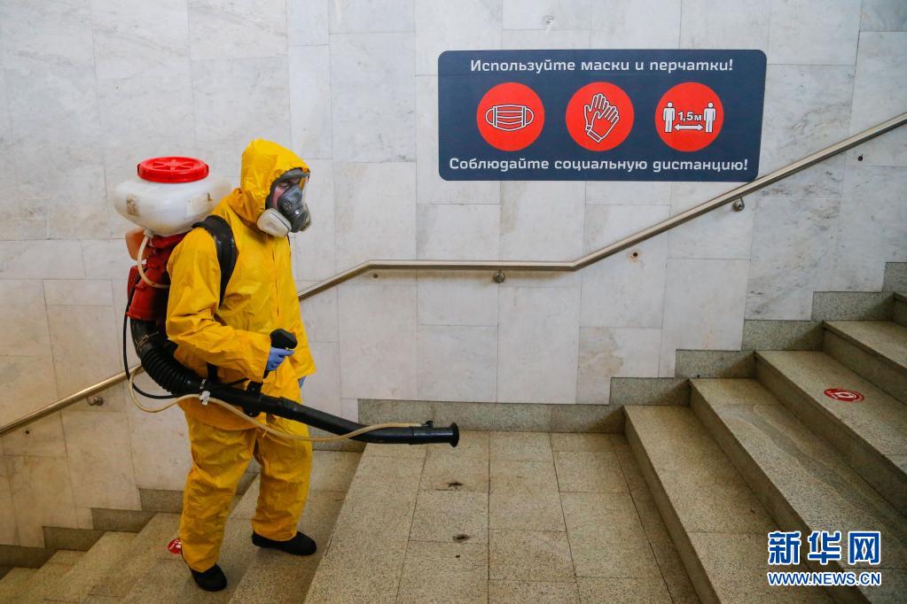 6月24日,工作人員身著防護(hù)服在俄羅斯莫斯科一個火車站進(jìn)行消毒作業(yè)。