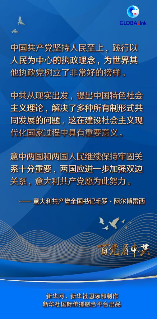 阿爾博雷西說,一百年來,中國共產(chǎn)黨帶領中國人民取得了巨大成就。中共積累的經(jīng)驗是國際共產(chǎn)主義運動史上的亮點,中共在國際共運歷史上樹立了重要標桿。
