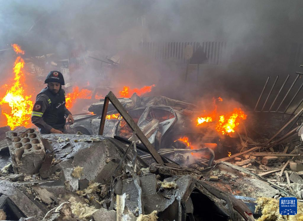 4月8日,救援人员在黎巴嫩首都贝鲁特扑救以色列空袭引发的火灾(手机照片)。新华社发(比拉尔·贾维希摄)