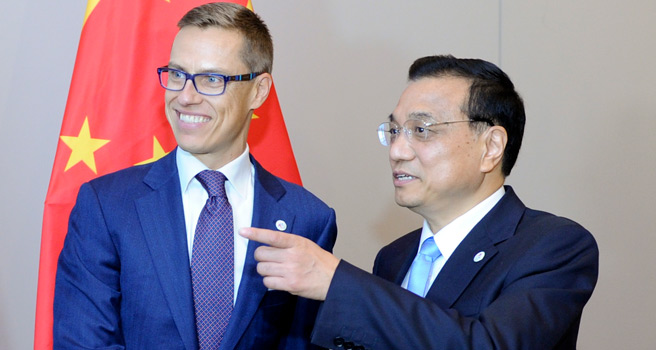 李克強(qiáng)表示,中芬關(guān)系十分牢固,在中國(guó)同西方國(guó)家關(guān)系中走在前列。兩國(guó)經(jīng)濟(jì)互補(bǔ)性強(qiáng)。雙方應(yīng)擴(kuò)大雙向投資,推進(jìn)科技創(chuàng)新、生態(tài)環(huán)保、信息通信等領(lǐng)域的合作。[詳細(xì)]